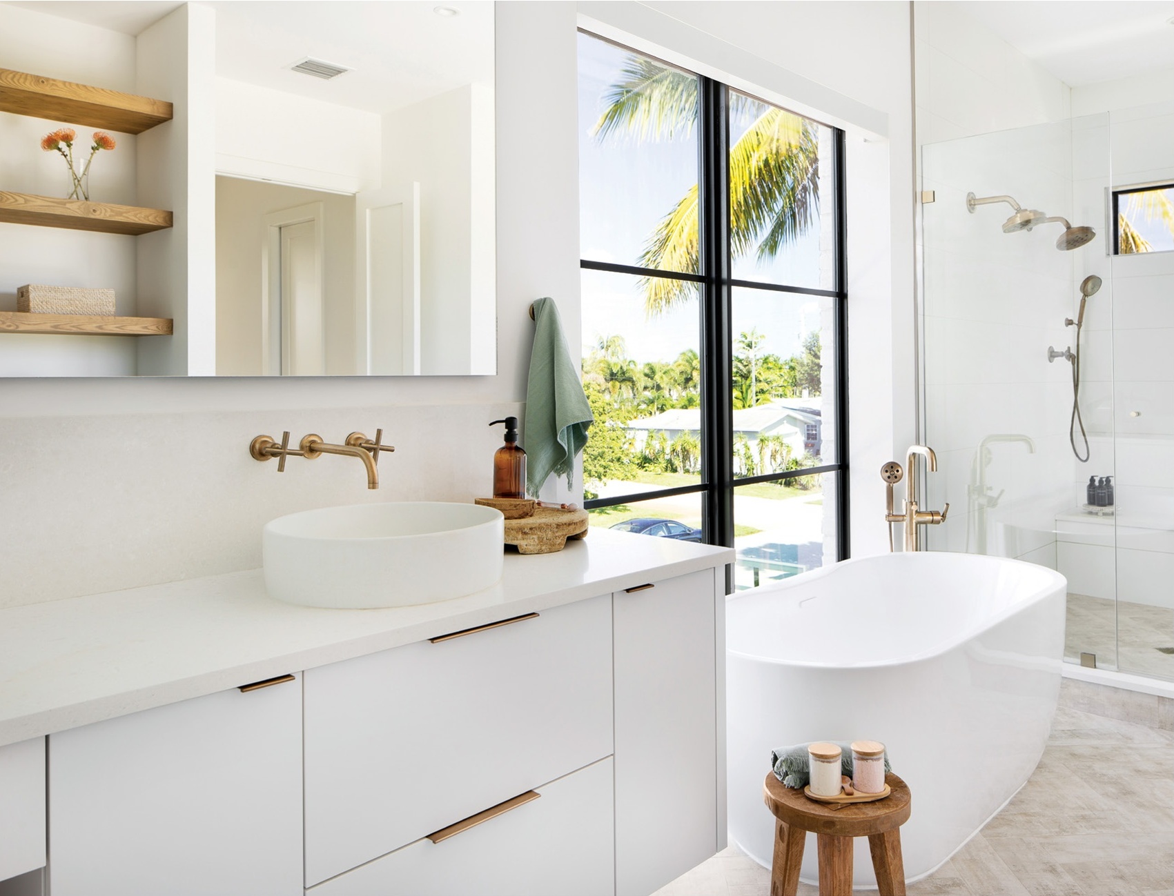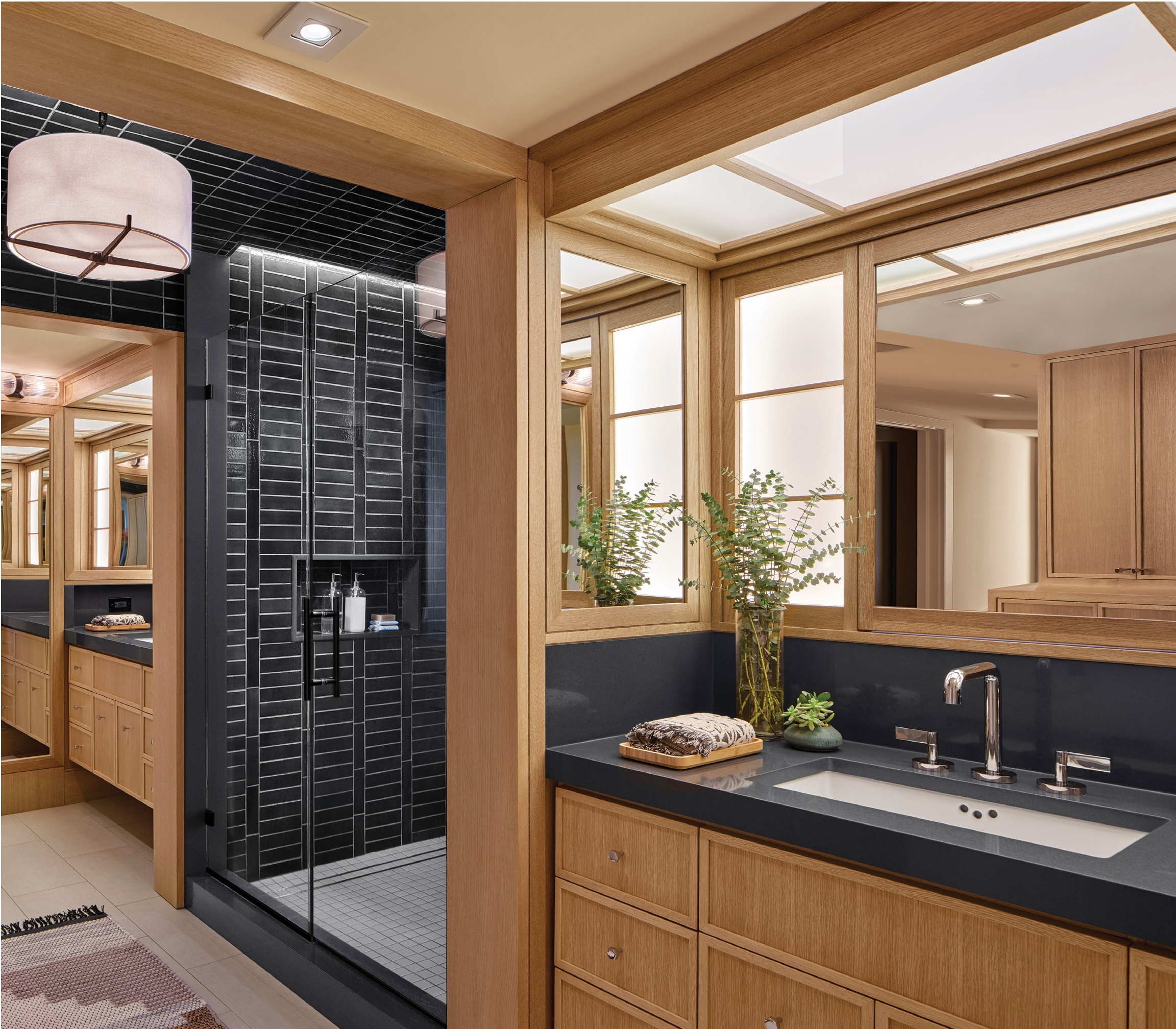 When it came time to update his clients’ coastal vacation home, designer MARCO ANGELUCCI had to find creative ways to maximize style and function while adhering to strict local building restrictions. In the primary bathroom, for example, he placed the vanities in front of the room’s main windows and used translucent panels inspired by Japanese shoji screens to create symmetrical illumination (and provide privacy). To make the neutral space more dynamic, he used contrasting tones and textures, playing low-luster finishes on the cabinets and floors against glossy Cambria Fieldstone countertops and slightly iridescent ceramic tiles.