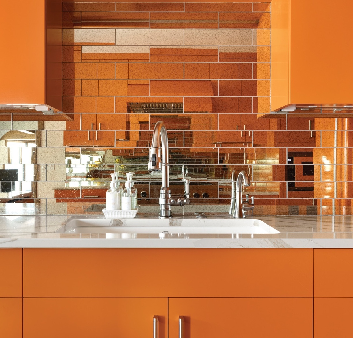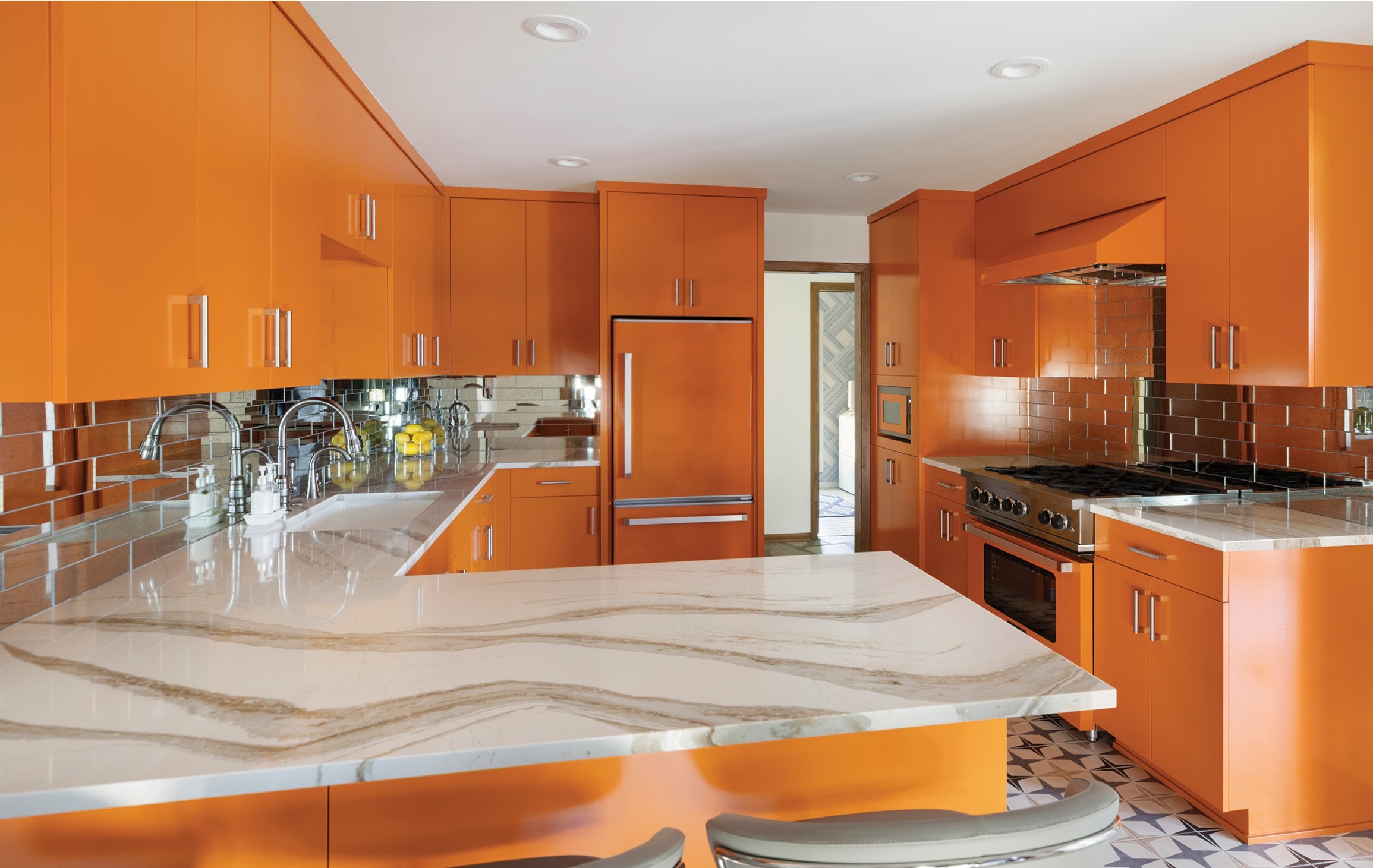 When renovating a Lake Minnetonka weekend home, designer SARAH RANDOLPH let the 1970s architecture and its owners’ personalities guide her design plan. “The whole vibe was just ‘have fun,’” says Randolph. That attitude comes through in full force in the kitchen. “My clients had found this great, retro refrigerator, so we matched the cabinets to its high-gloss orange finish,” Randolph says. Cambria countertops in warm Brittanicca Gold were a natural choice for their durability and easy maintenance—essential in a house that’s all about fun.
