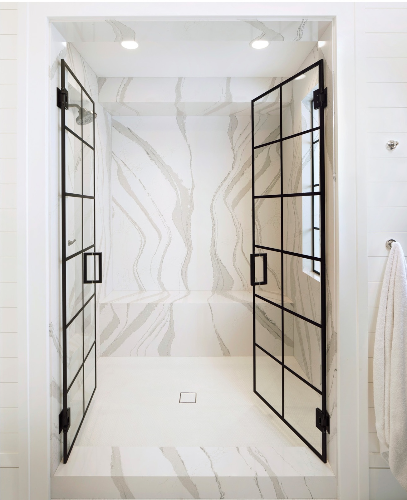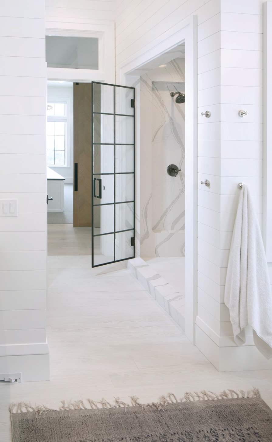 In the spectacular bathroom she created for former Minnesota Viking Kyle Rudolph and his wife, Jordan, AMANDA LORENZ of Henri Interiors let a very special material drive the design. “When we saw the possibilities for seamless vertical installation at the Cambria factory, Jordan knew immediately that she wanted the Brittanicca design in her bathroom,” says Lorenz. To give the space a “contemporary but warm and inviting” look, Lorenz balanced the sleek stone shower with rich textures throughout the rest of the space—and added subtle farmhouse flavor with a boldly contrasting metal shower door.