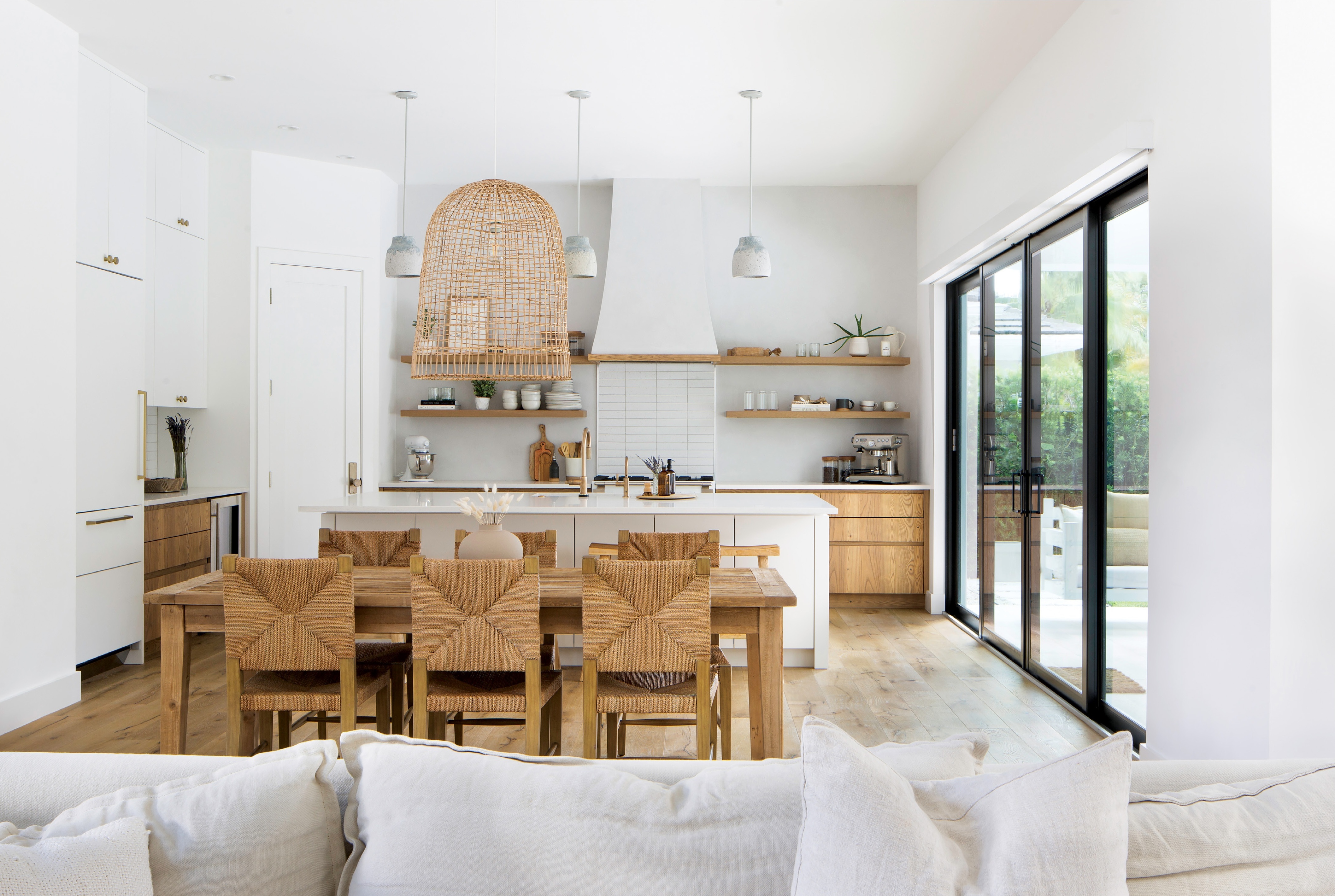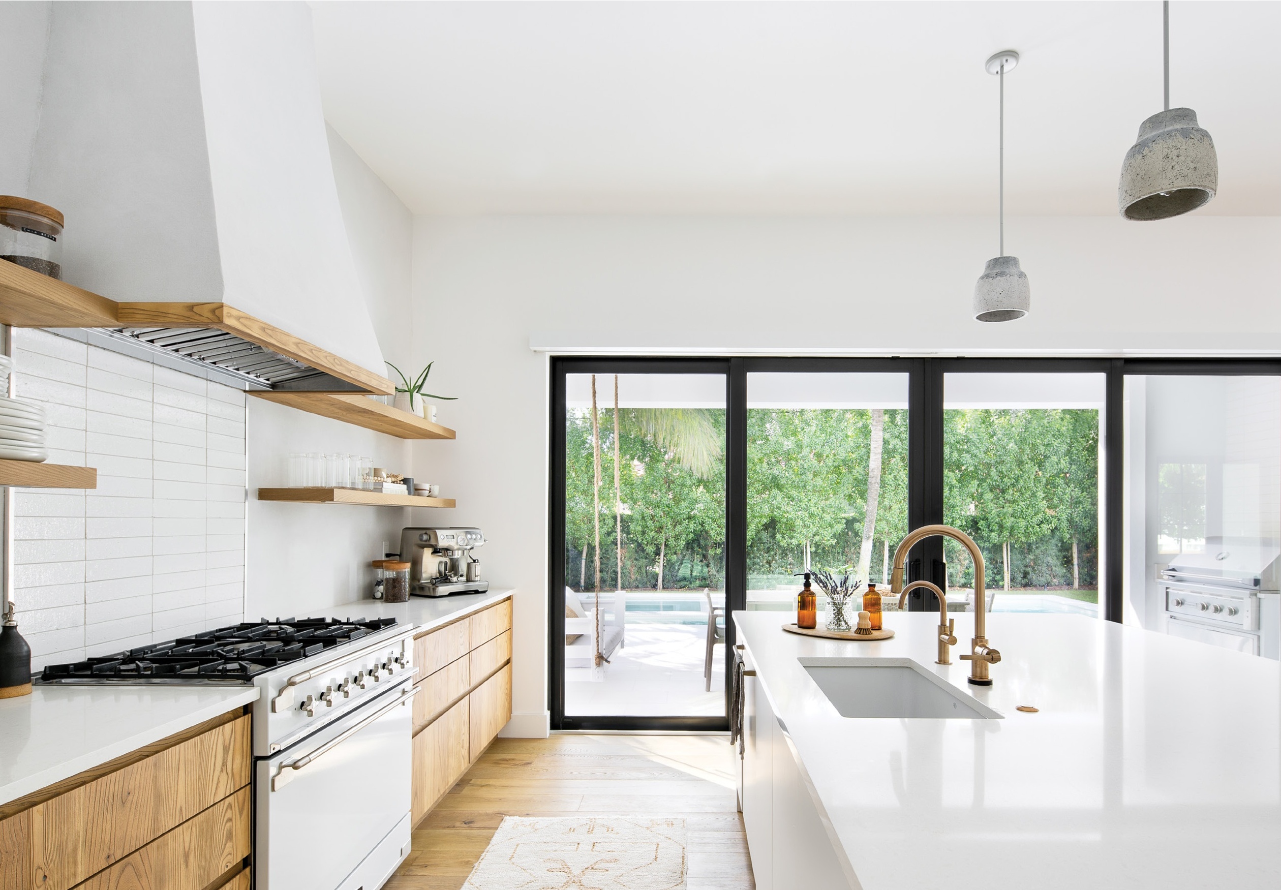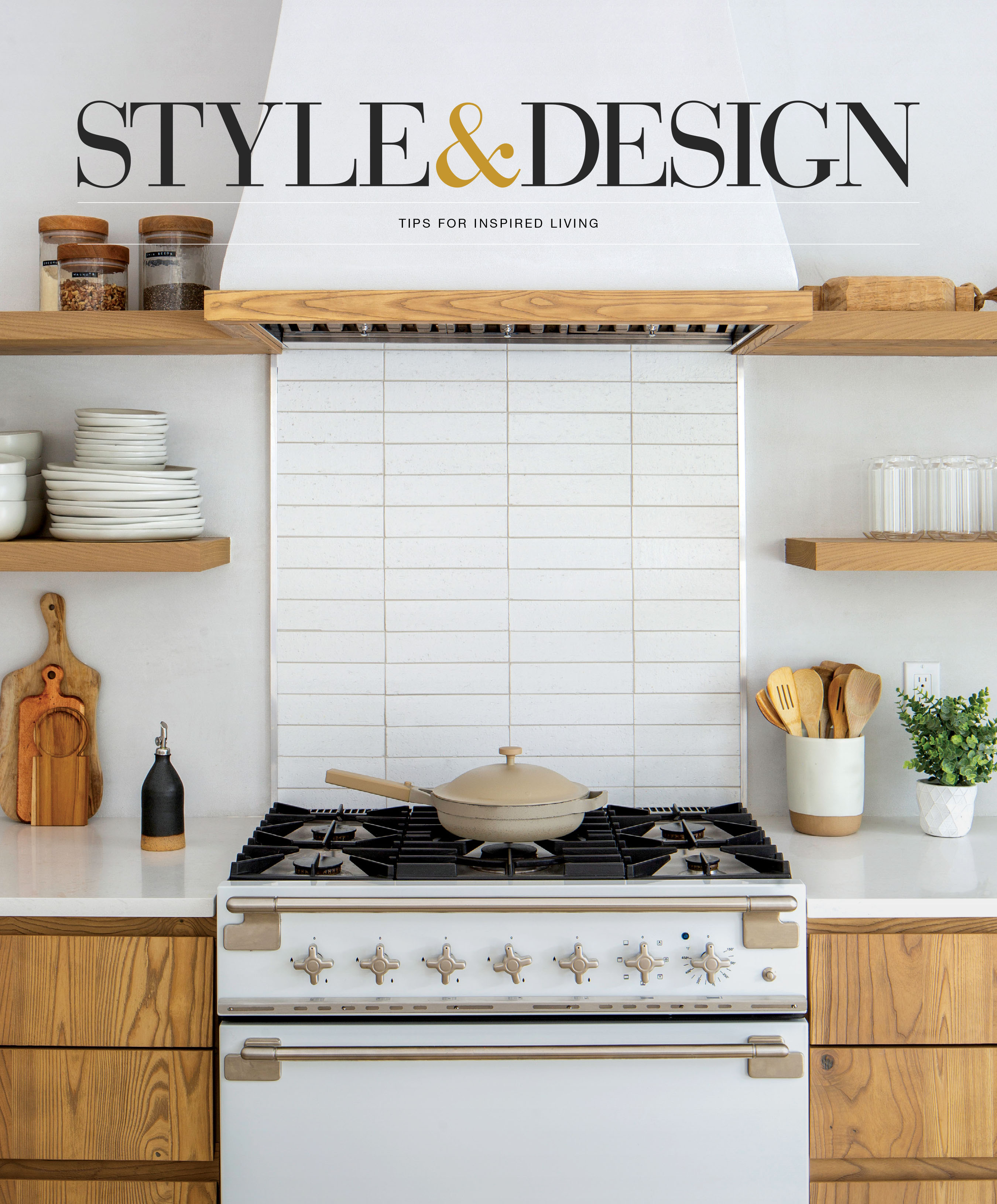 OPENER PG 9: Countertops in Newport Matte by Cambria, CambriaUSA.com. Decorative clay backsplash tile in Palm Beach White Gloss from ASD Surfaces, asdsurfaces.com. Cabinets by Miralis Custom Cabinets, miralis.com. Elise range by AGA, agarangeusa.com. Always Pan in Spice by Our Place, fromourplace.com.