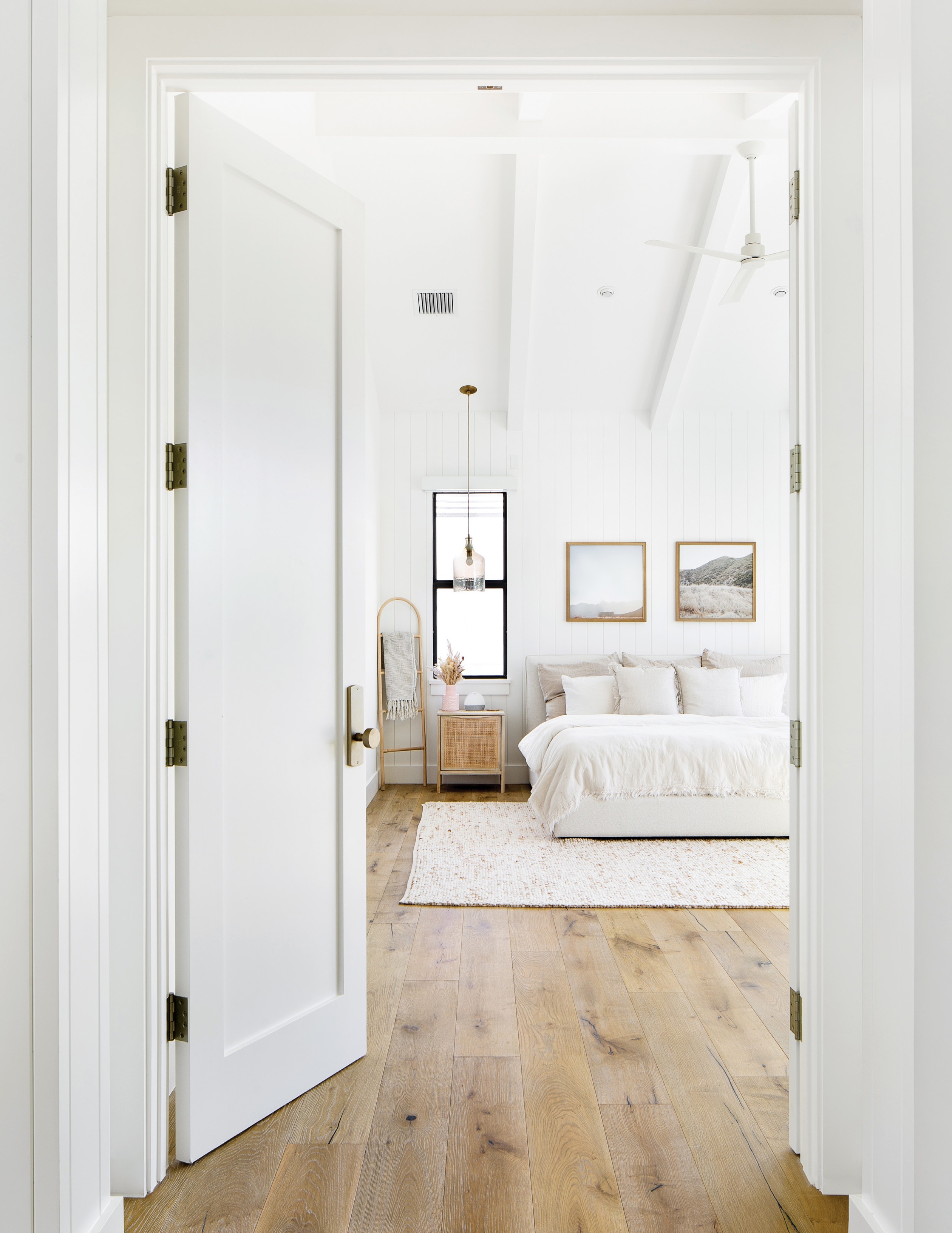 INTERESTING FINISHES—A WIRE-BRUSHED FINISH ON THE VANITY AND NICKEL-GAP SHIPLAP ON THE WALLS—HELP ADD SOFTNESS TO SPACES (LIKE BATHROOMS) THAT ARE FULL OF HARD, REFLECTIVE SURFACES.