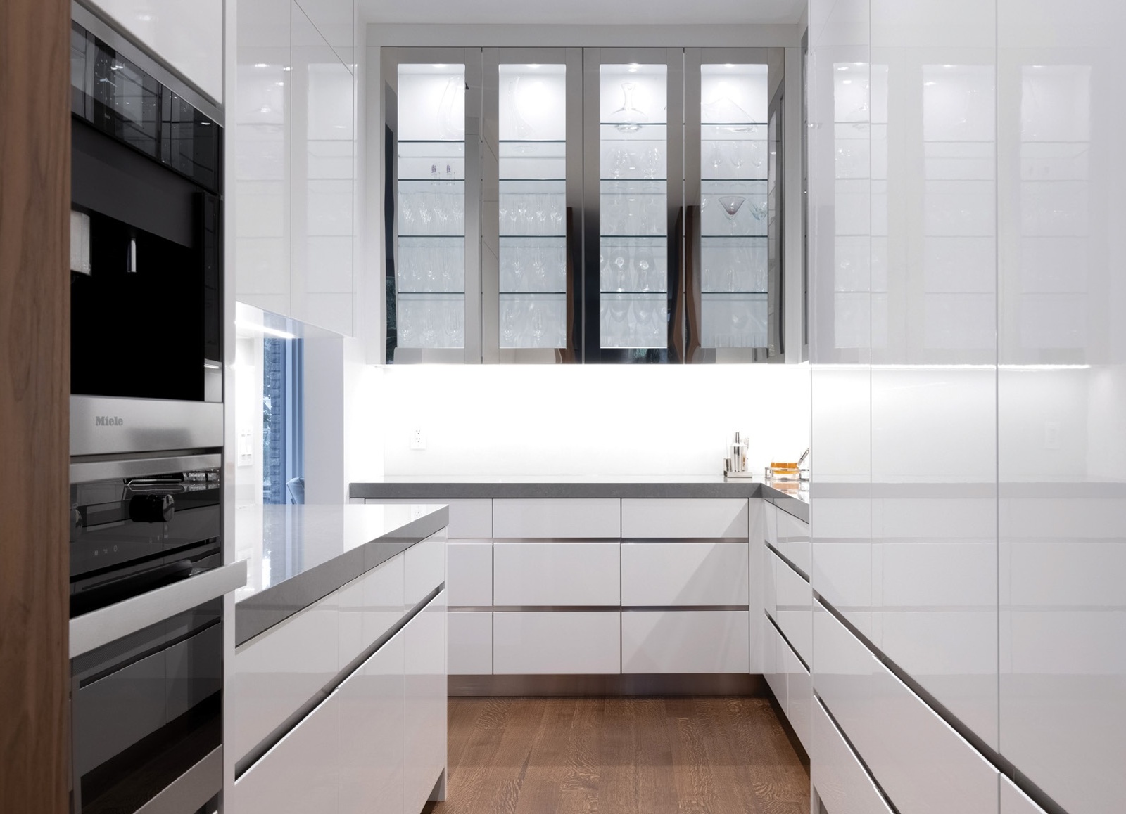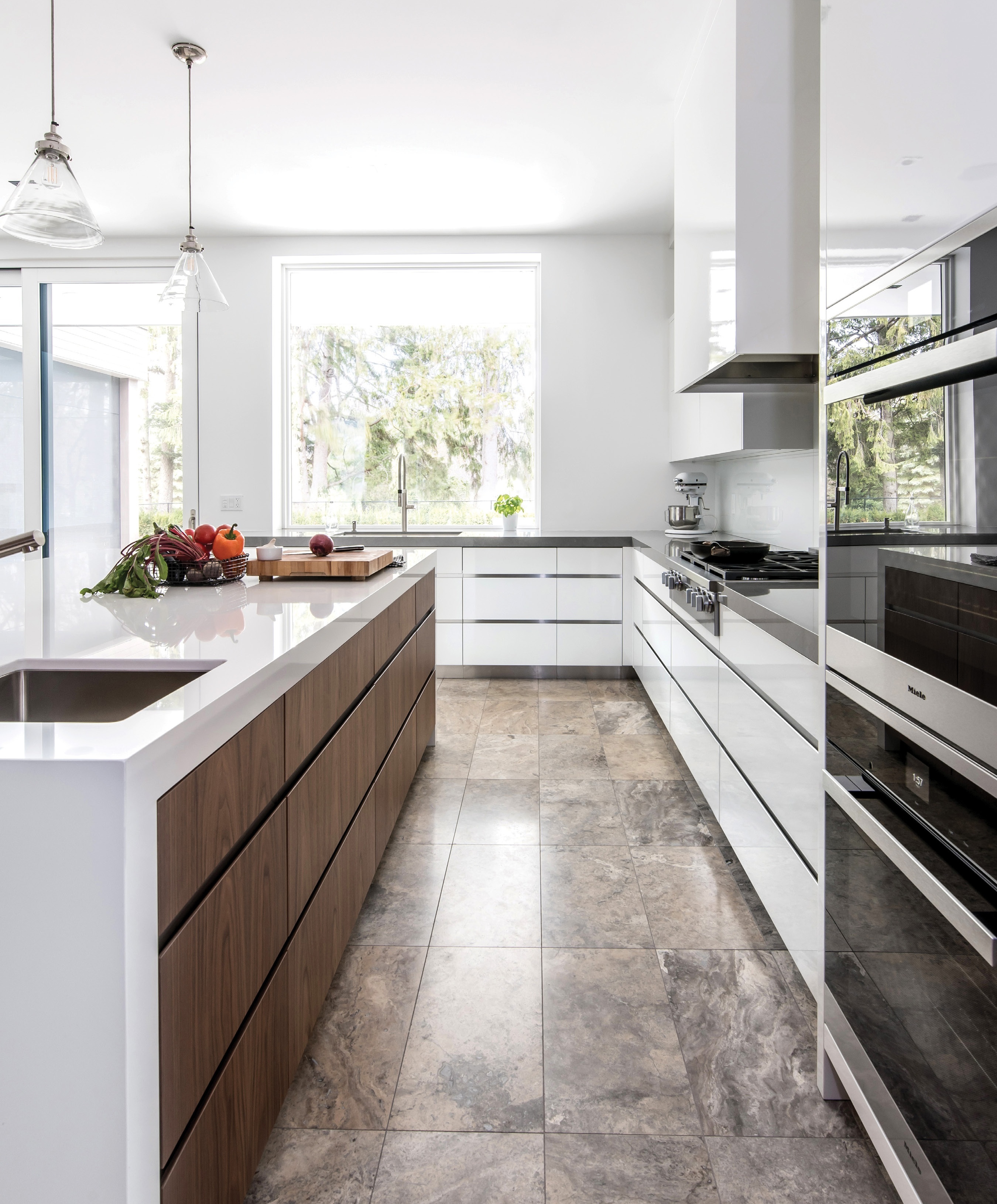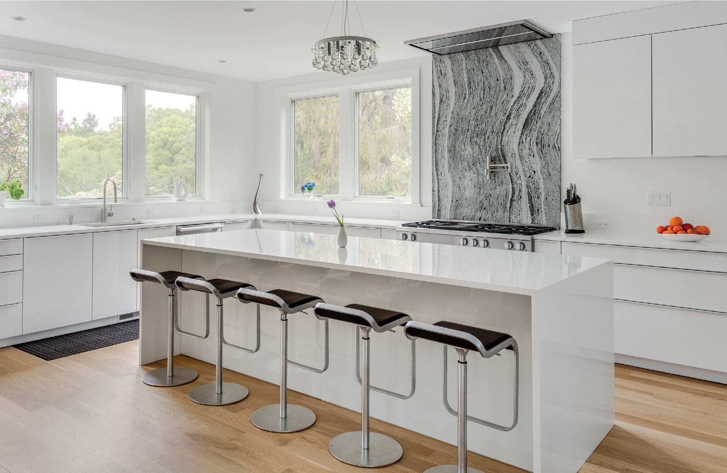 Architect SALLY DeGAN let her clients’ personal aesthetic inspire her design for the renovated kitchen of an older New England home. “The couple is originally from Sweden, and they like clean, Scandinavian design—but with a modern twist,” says DeGan. Accordingly, the architect specified high-gloss Poggenpohl cabinets throughout and combined Cambria’s White Cliff on the countertops with Cambria Roxwell as a dramatic focal point on the backsplash. “The Roxwell behind the range has great movement—it almost looks like flames,” says Jon Mancini of installer and fabricator Boston Counters. Natural oak floors lend an organic softness underfoot, balancing the glossy white, gray, and stainless steel palette.
