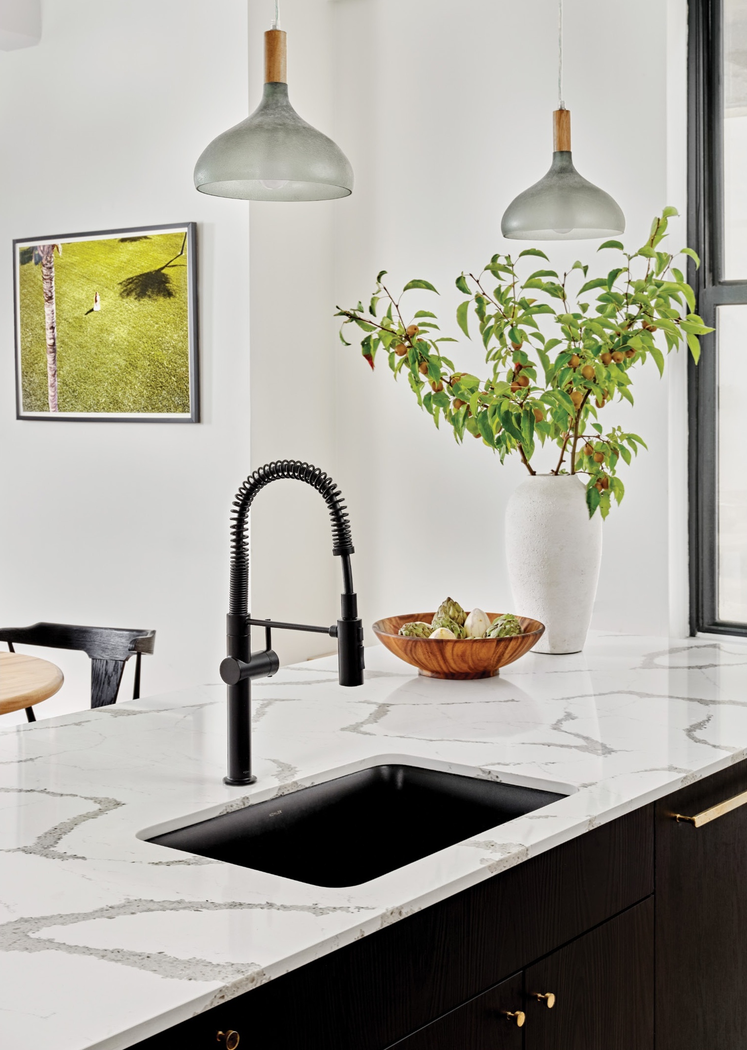 WE WERE GOING FOR A LITTLE BIT OF A PALM SPRINGS LOOK, WHICH MEANT PLENTY OF EASY ELEGANCE. WARM METALLIC FINISHES, [CAMBRIA QUARTZ] COUNTERTOPS, LEATHERACCENTED LIGHT FIXTURES—THERE’S SOMETHING A LITTLE ‘EXTRA’ WHEREVER YOU LOOK.