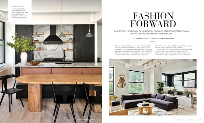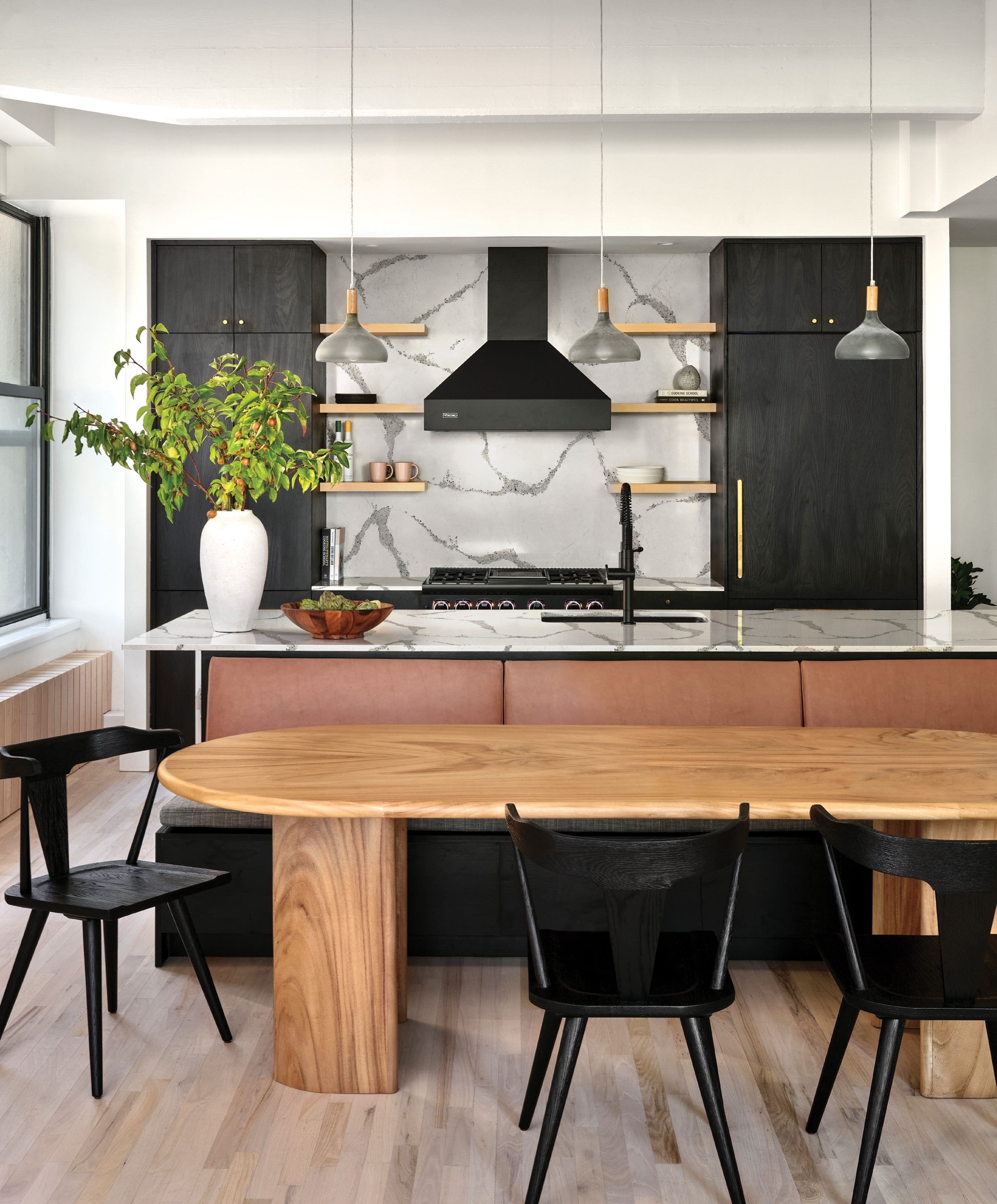 KITCHEN/DINING PG 42: Acacia-veneer dining table and black stained-oak chairs from Lulu and Georgia, luluandgeorgia.com. Countertop and full-height backsplash in Cambria Queensbury, CambriaUSA.com.