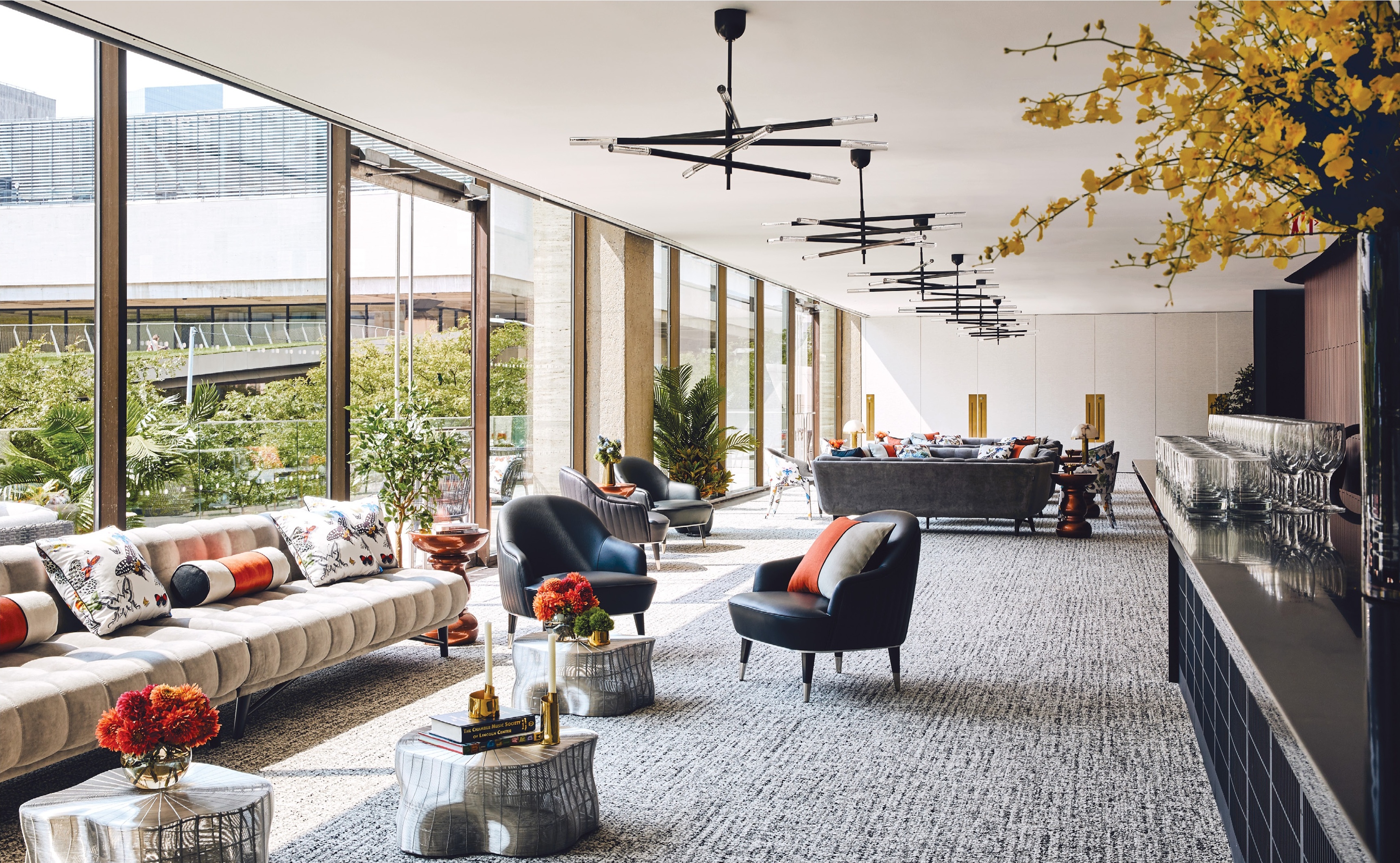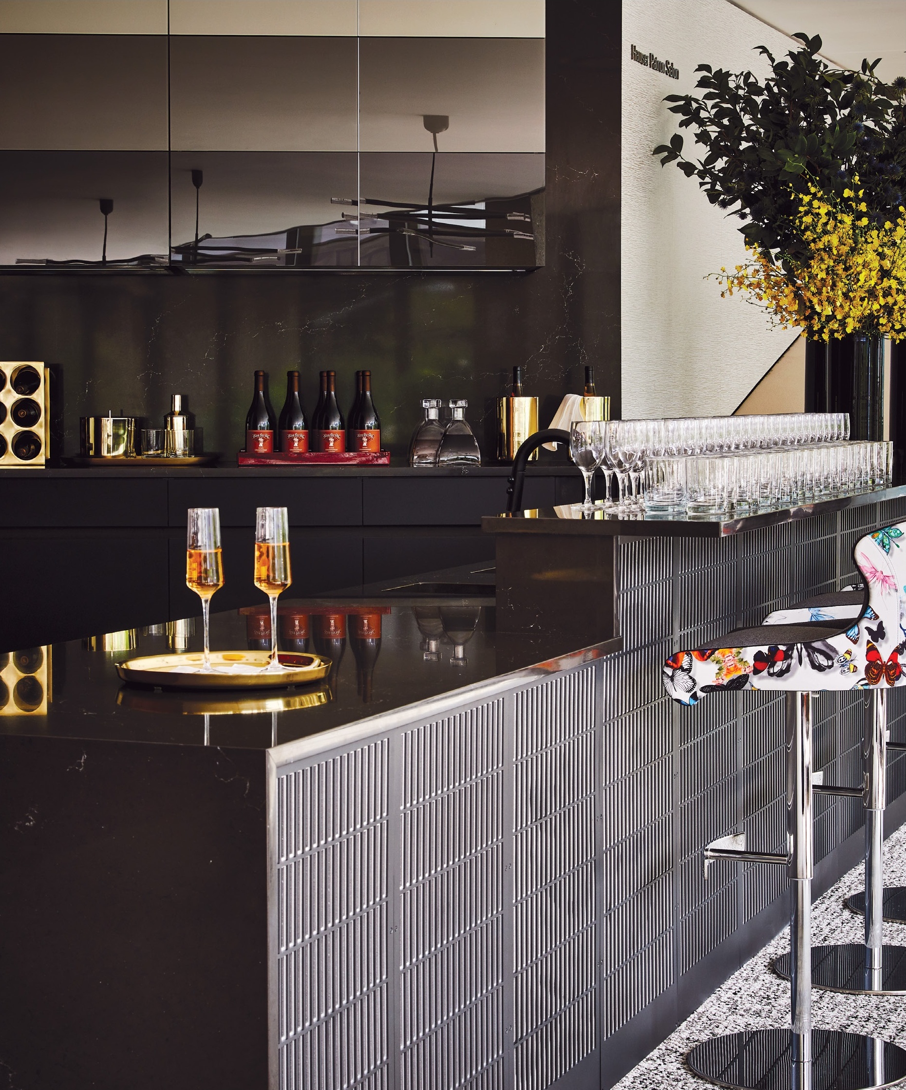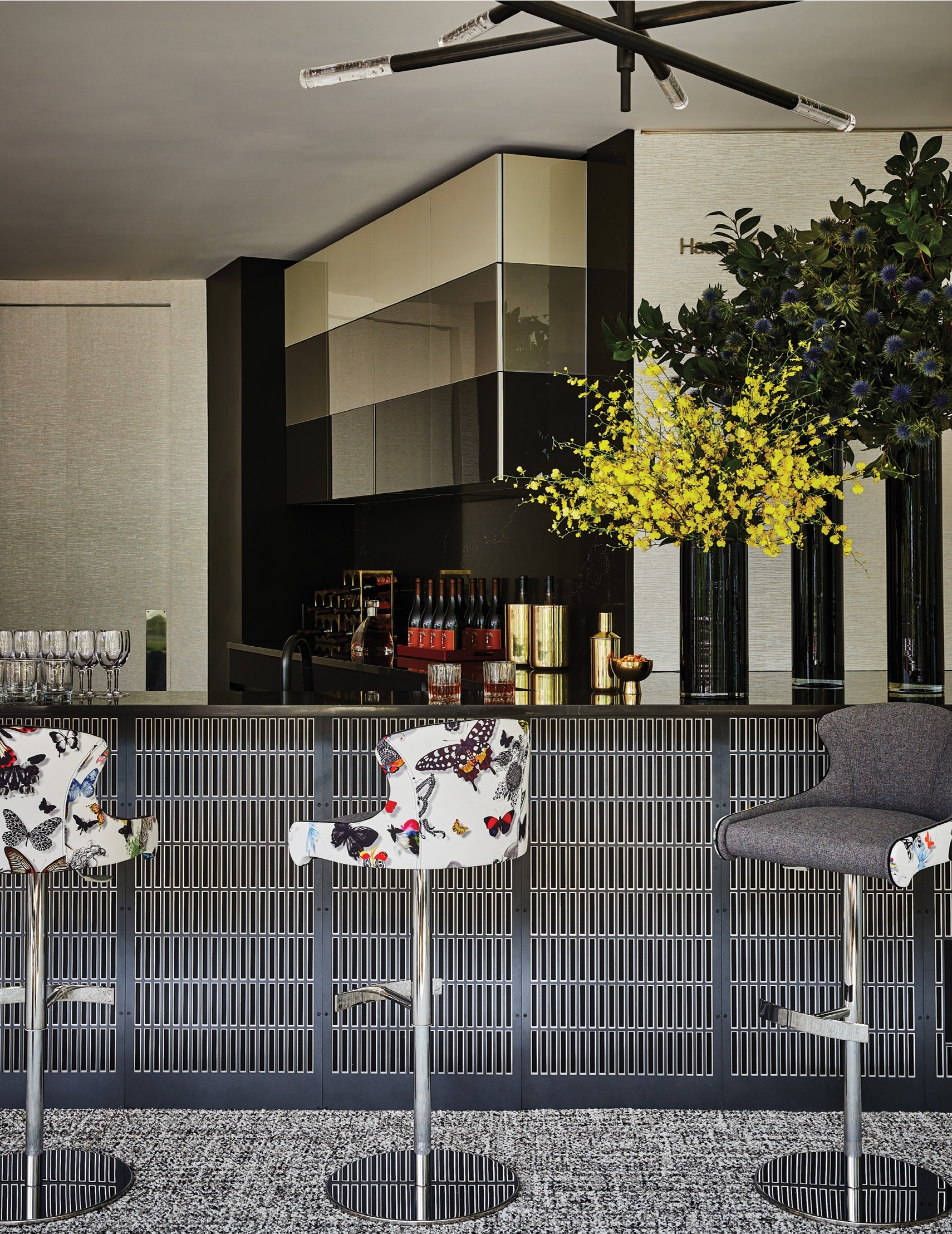 CambriaUSA.com. Bar cabinets by Scavolini, scavoliniusa.com. Custom bar front grilles by Architectural Grille, archgrille.com. Bar stools, sofa, chairs, and cocktail tables by Roche Bobois, roche-bobois.com. Pillows in Butterfly Parade design by Christian Lacroix, christian-lacroix.com. Pendant light by Kelly Wearstler for Circa Lighting, circalighting.com. Carpet by FLOR, flor.com. Ceiling paint by Sherwin-William, sherwin-williams.com.