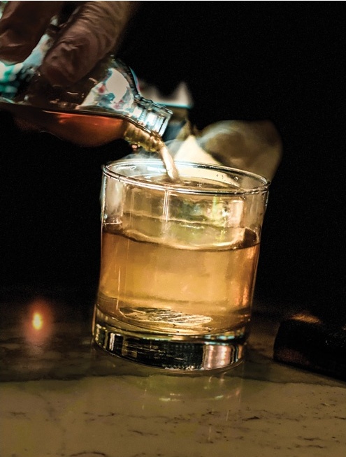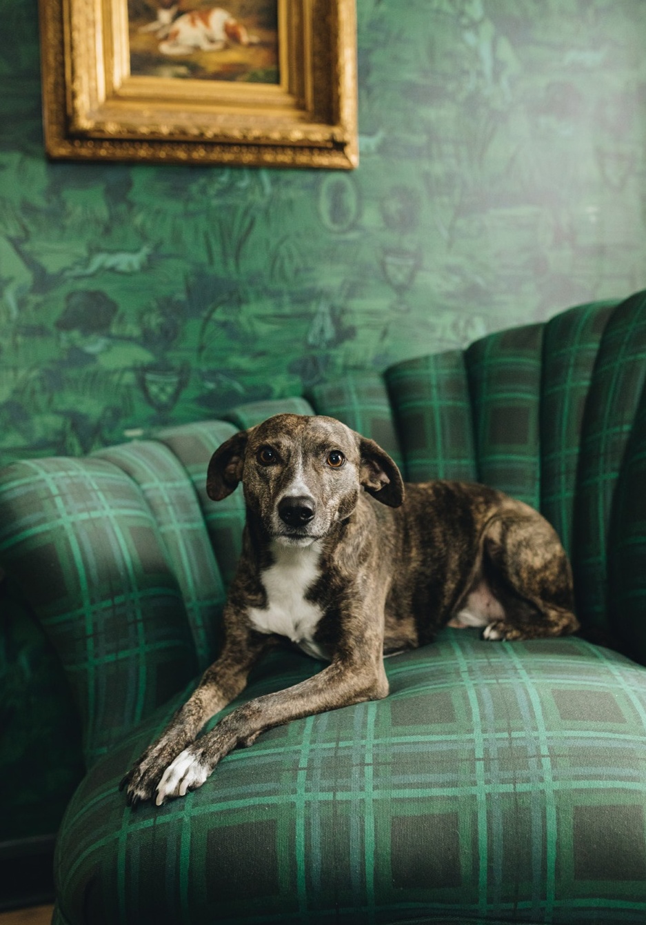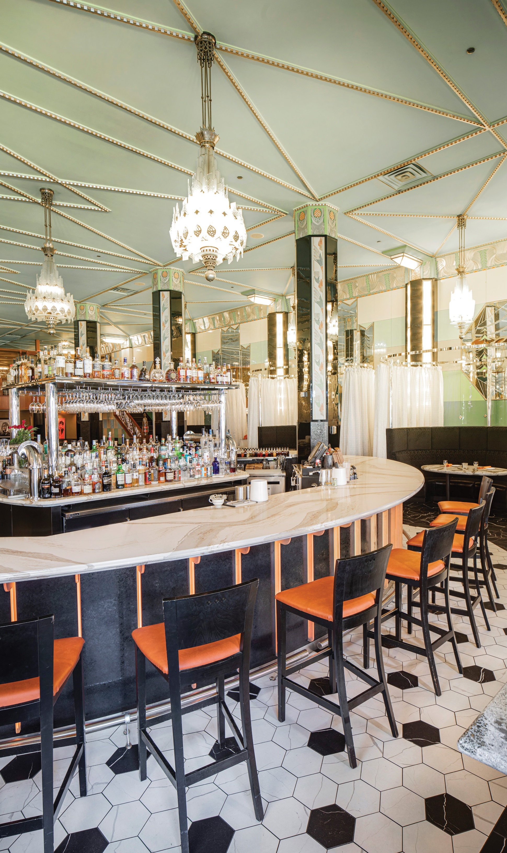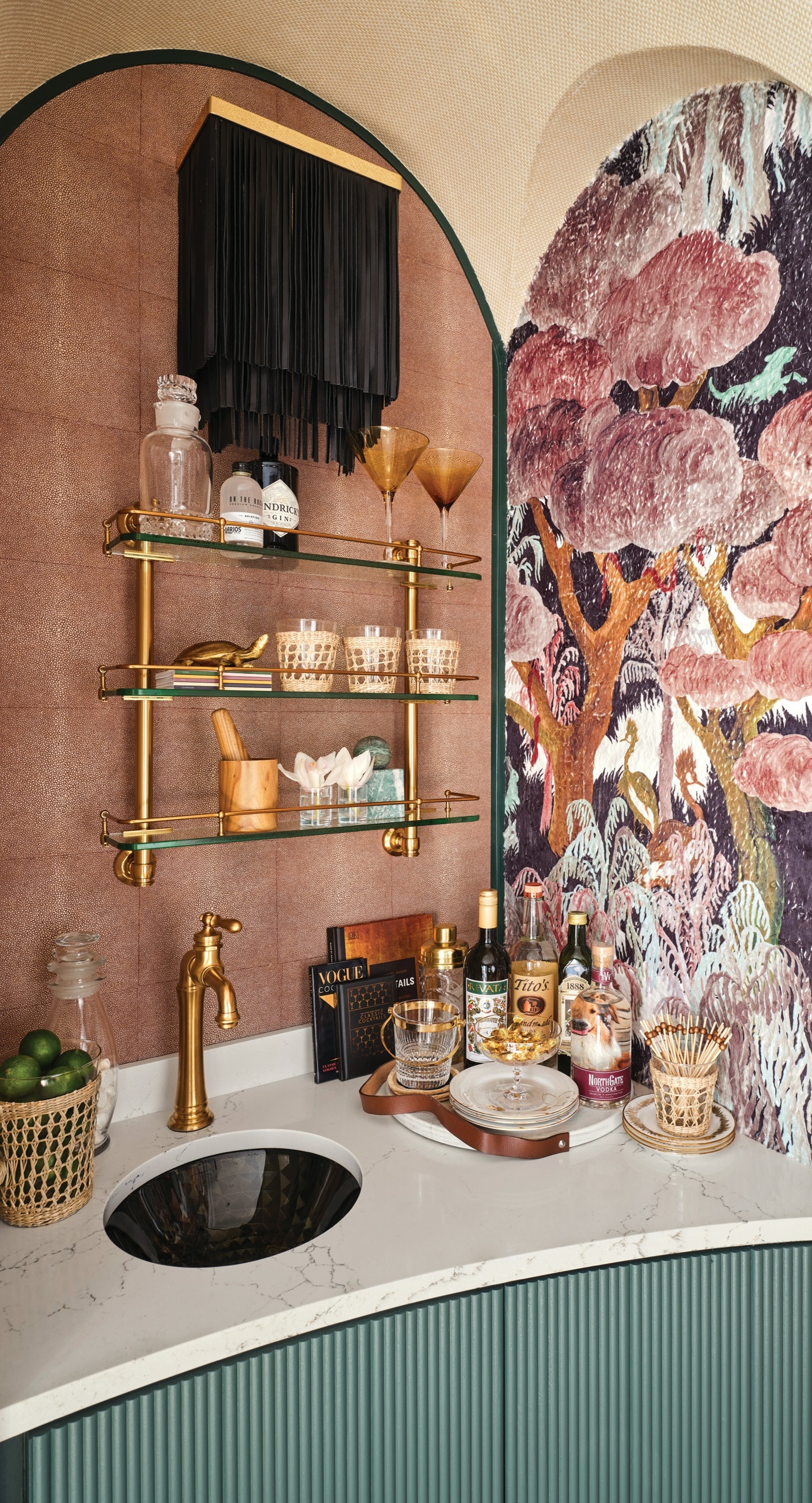 KITCHEN PG 12: Colton bar countertops by Cambria, CambriaUSA.com. Wall and cabinetry paint in Goodwin Green (CS-555) by Benjamin Moore, benjaminmoore.com. High-gloss plaster ceiling by Color Unlimited Painting, colorunlimitedpainting.com. Ndidi wall sconce in black from Ngala Trading, ngalatrading.com. Brushed brass Artifacts Gentleman’s bar sink faucet and Kallos undermount sink by Kohler, kohler.com. Wonderwoods cinnamon wall covering mural and Icons Shagreen in rose brown by Arte Wallcoverings, arte-international.com. Barware from Replacements LTD, replacements.com. Accessories from Joanna Buchanan, joannabuchanan.com.