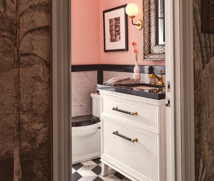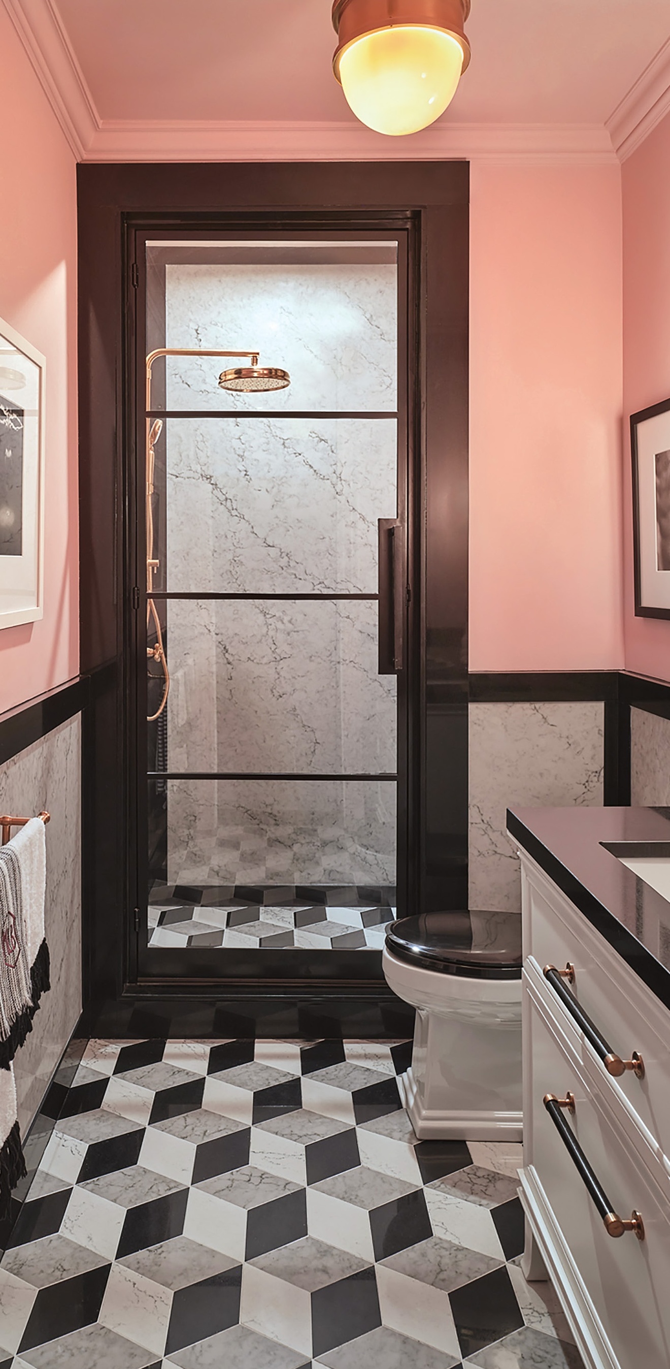 BATHROOM PG 10: Shower surround, walls, and floor in Bridport; trim, vanity top, and second flooring design in Cambria Black; third flooring design in Sutherland by Cambria, CambriaUSA.com. Faucets, fixtures, and vanity by Kohler, kohler.com. Paint in Desert Rose by Benjamin Moore, benjaminmoore.com.