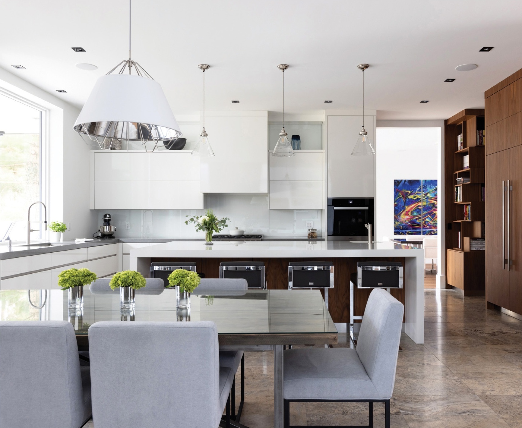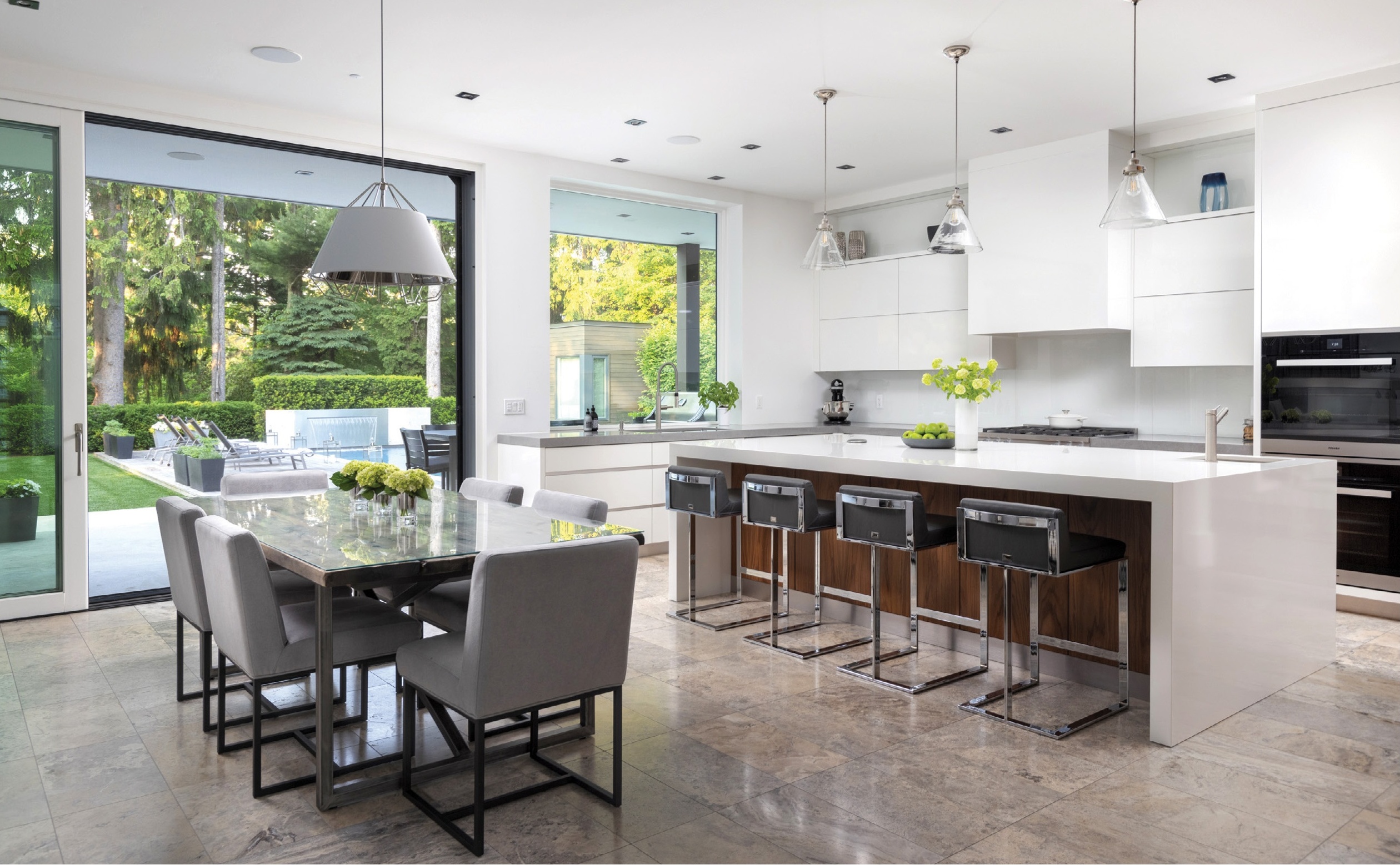 KITCHEN PG 24–26: Cabinetry by Top Notch Cabinets Inc., topnotchcabinets.com. Dining table from Elte, elte.com. Dining chairs from Elte Mkt, eltemkt.com. Dining table pendant light from Déca Lighting, decaltg.com. Island stools from Chair Source, chairsource.ca. Island pendant lights from Hudson Valley Lighting, hudsonvalleylighting.hvlgroup.com.