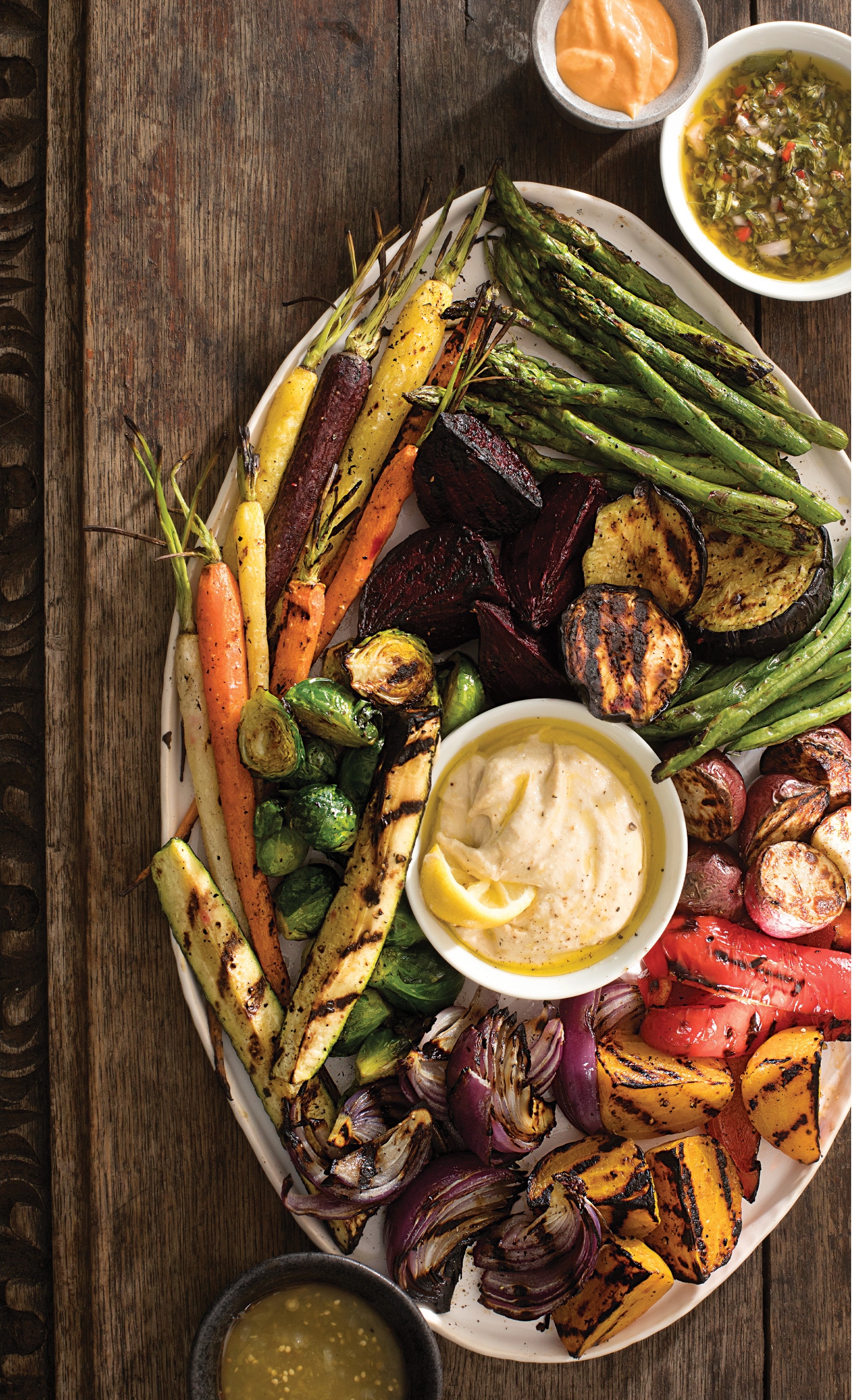 Learn how to make chimichurri and aioli dipping sauces for those vegetables as well as Grilled Teriyaki Cauliflower Steaks and Sriracha Pork Belly Skewers. We’ve also included a decadent peach dish to give your celebration a sweet finish—it’s all waiting for you online.