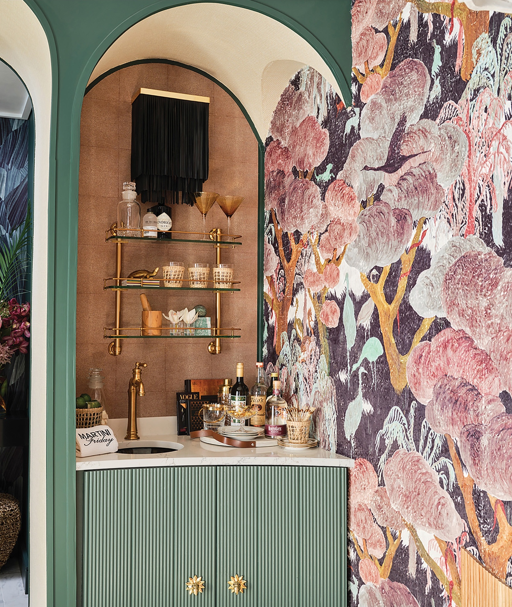To give a petite poolside bar of the Kips Bay Decorator Show House Dallas a glamorous look befitting its setting, designer TRACI CONNELL pulled out all the stops, layering luxe textures and patterns on every available surface. “The richly textured, whimsical wallpaper gets all the attention,” says Connell, “but the other surfaces, from the faux-shagreen wall covering on the back wall to the fluted cabinet doors to the Cambria Colton countertops add the layers of rich interest that make the space.”