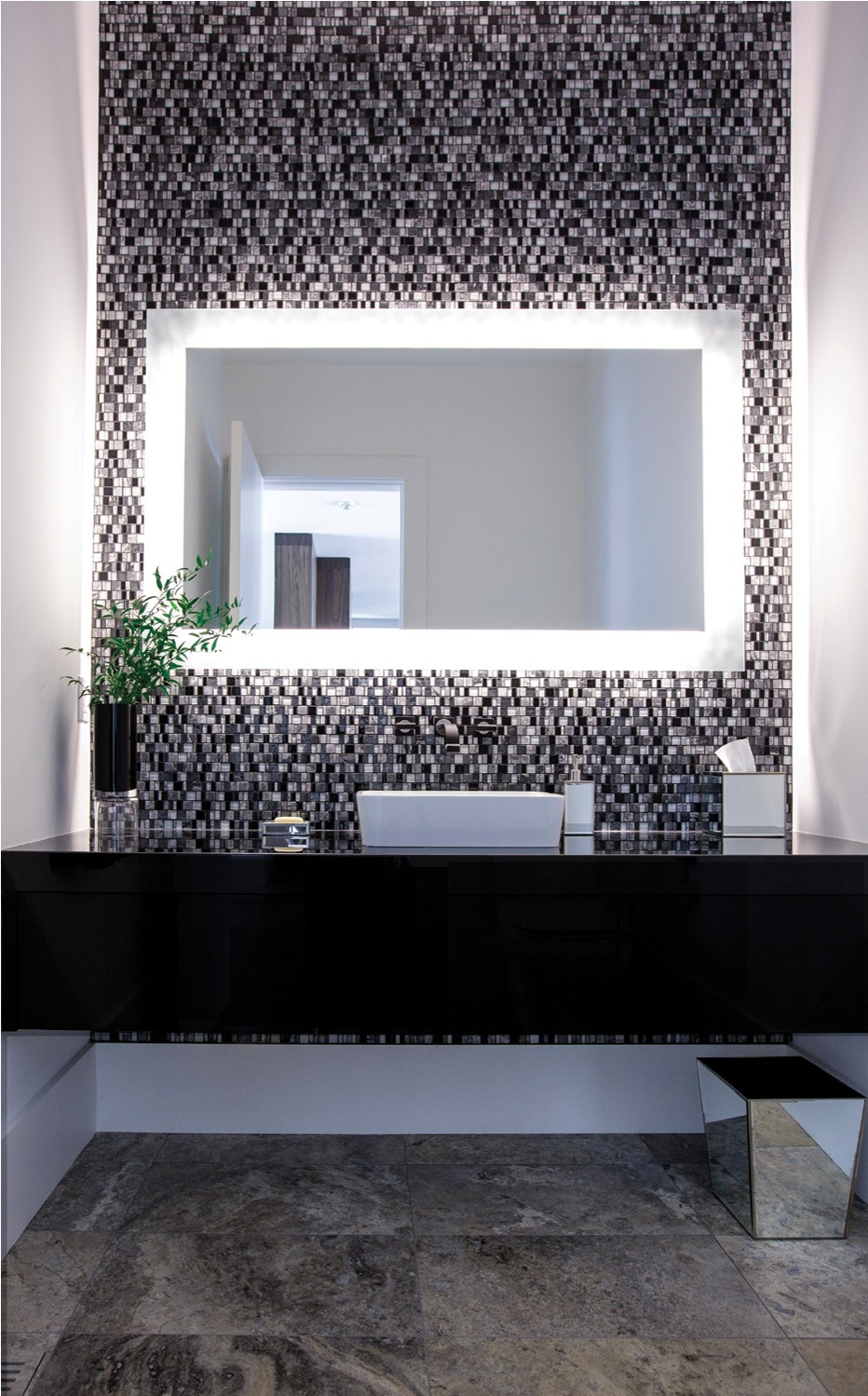 BATHROOM PG 35: Countertops in Newport Matte by Cambria, CambriaUSA.com. Floor tile in Modal Ash Matte and crystal polished glass shower wall tile with porcelain back from ASD Surfaces, asdsurfaces.com. Sink faucets, shower controls, thermostatic valve trim, volume control valve trim, hand-held shower, and shower head all from Brizo, brizo.com. Shower enclosure from A-Christian Glass, a-christianglass.com.
