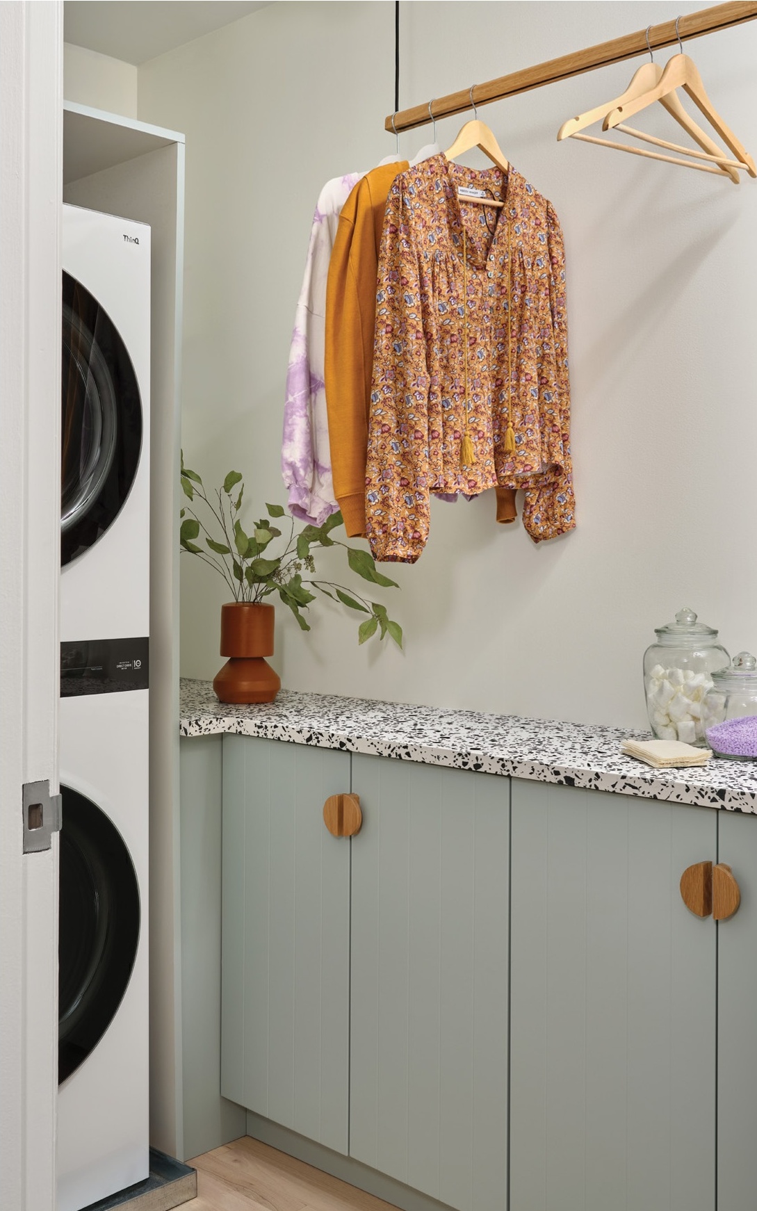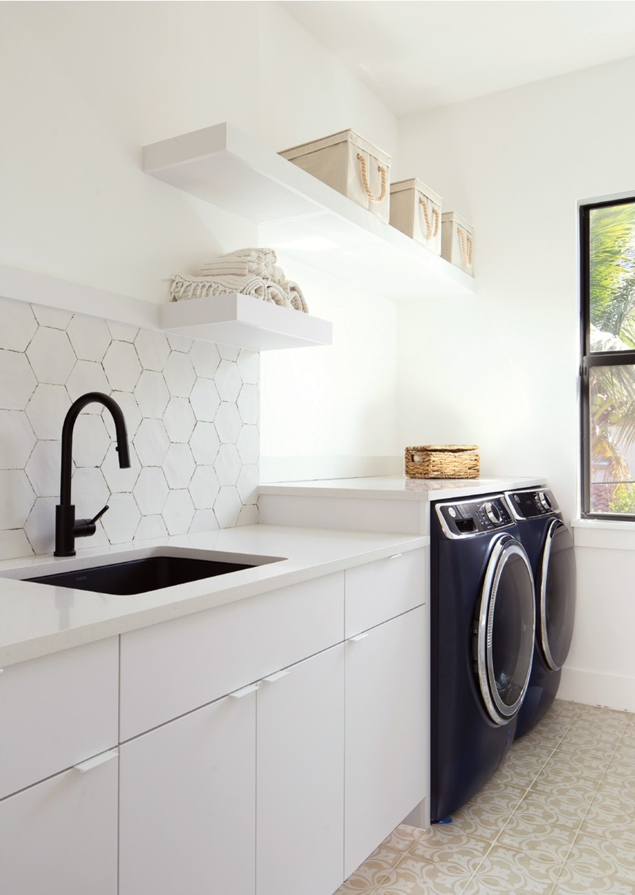 LAUNDRY ROOM PG 35: Appliances by Electrolux, electrolux.com. Countertops in Newport Matte by Cambria, CambriaUSA.com. Porcelain floor tile in Bamba Butter and backsplash tile in Organic Chalkboard White from ASD Surfaces, asdsurfaces.com. Drop-in undermount Liven sink in Matte Black by Blanco, blanco.com.