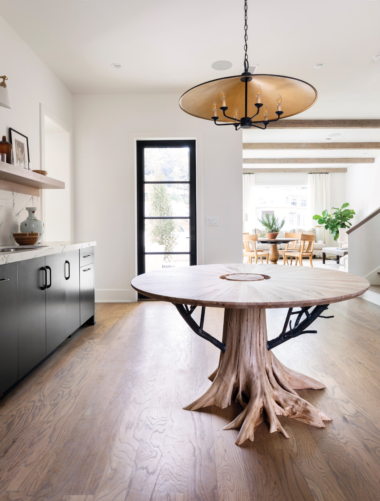 DINING PG 17: Counter in Archdale Matte by Cambria, CambriaUSA.com. Vintage items from Golden Oldies Antiques, goldenoldiesantiques.com and Scott Antique Market, scottantiquemarket.com. Pottery from Tenango, tenangoinc.com. Tree table created by Lucas Berry. Chandelier from Currey & Company, curreyandcompany.com.