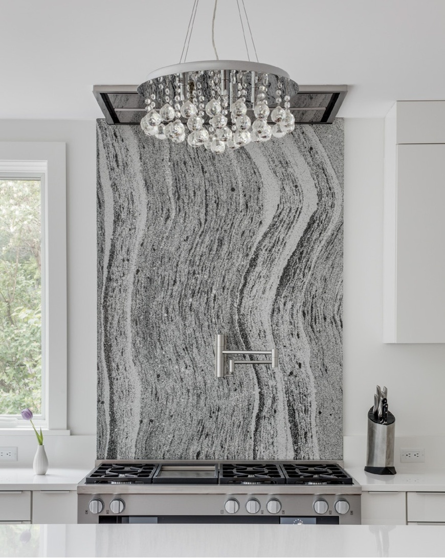 CAMBRIA IS AN IDEAL MATERIAL FOR A BACKSPLASH TREATMENT LIKE THIS ONE, BECAUSE YOU GET THAT HIGH-IMPACT MOMENT WITHOUT THE MAINTENANCE OF THE GROUT LINES TILE WOULD HAVE.
