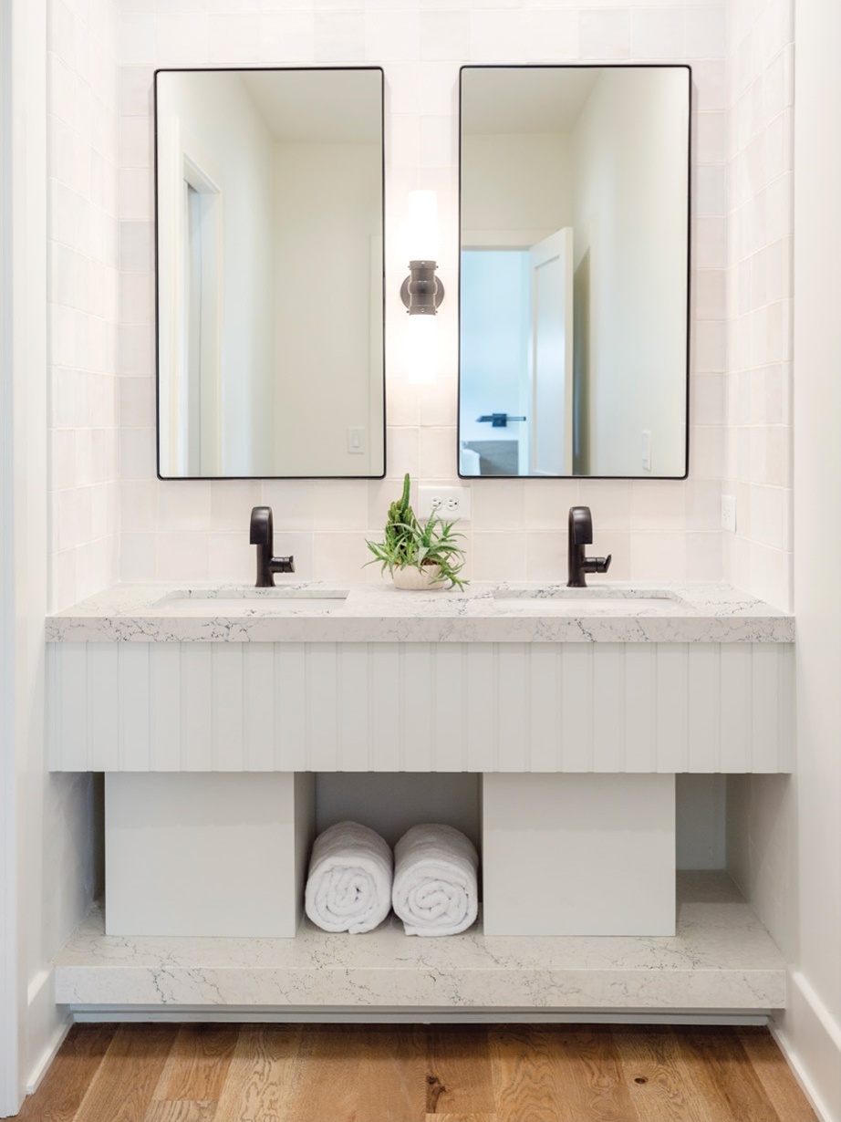 Cartwright put the spaces beneath bathroom vanities to good use as additional linen storage.