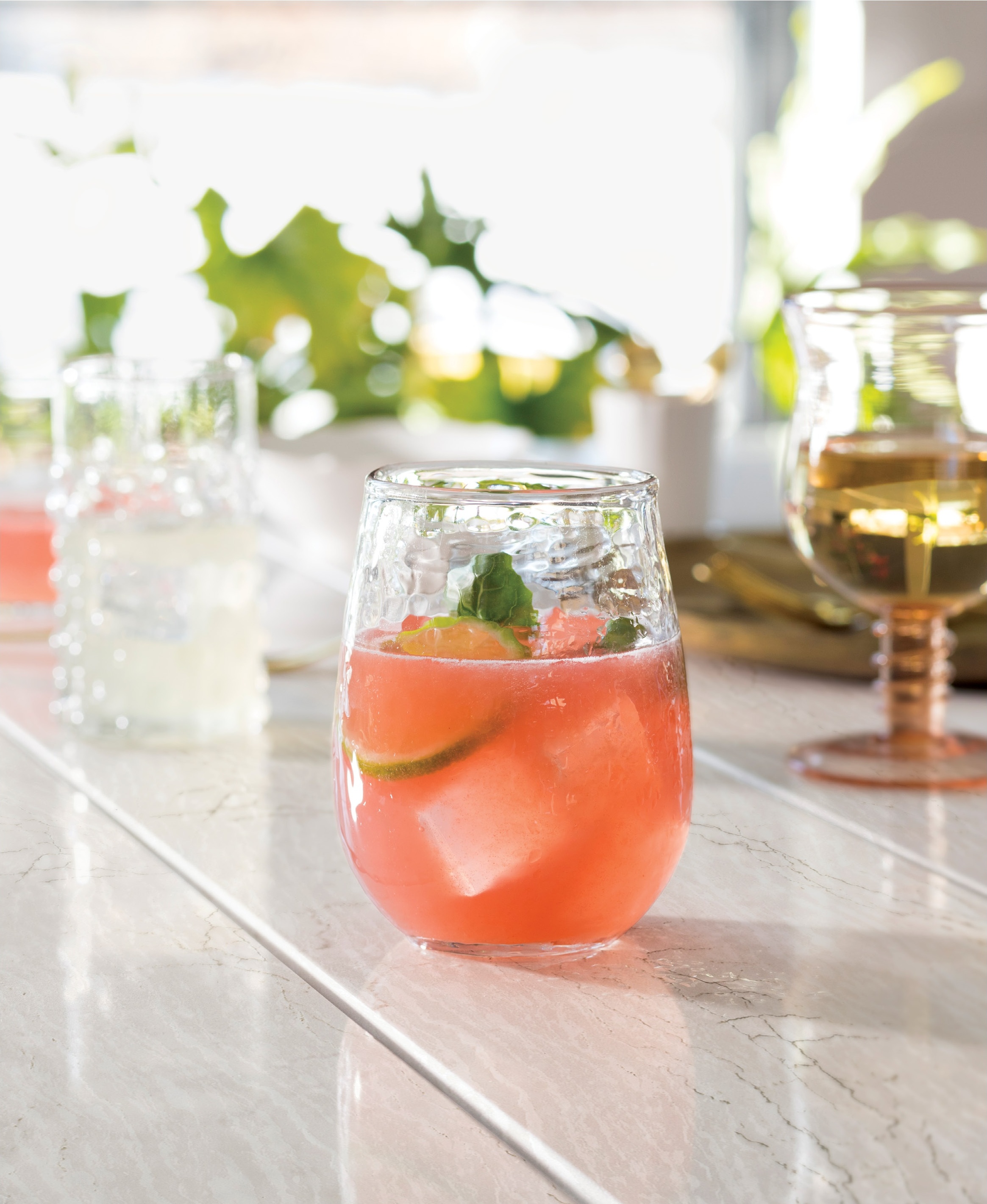 GUAVA BASIL BUCK PG 57: Recycled stemless glass from Foxwell, thefoxwell.com. Hobnail clear drinking glass from Rolling Green, rghomeandgarden.com. Artois wine glasses from Anthropologie, anthropologie.com.