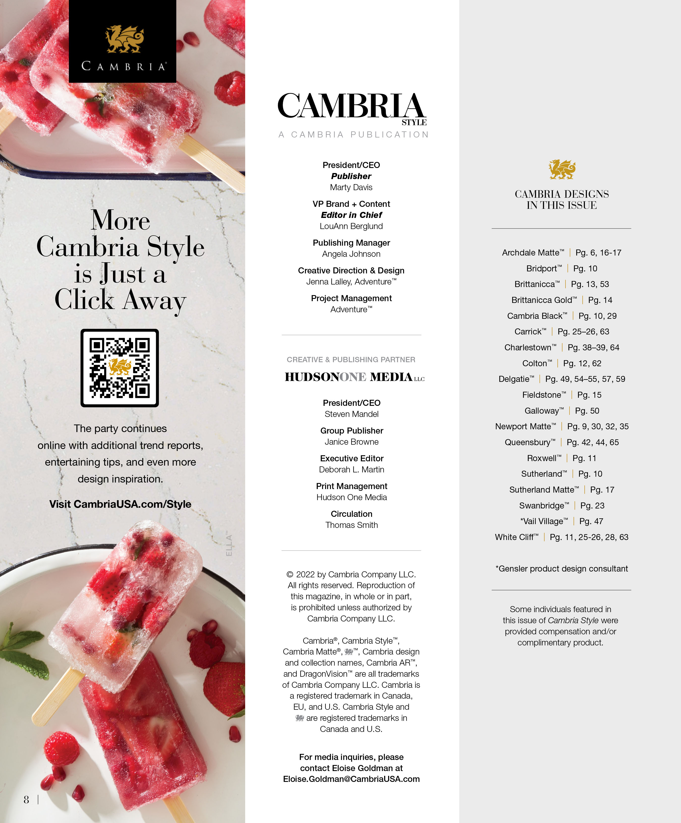 KITCHEN PG. 16: Perimeter and island countertops in Cambria Archdale Matte, CambriaUSA.com.